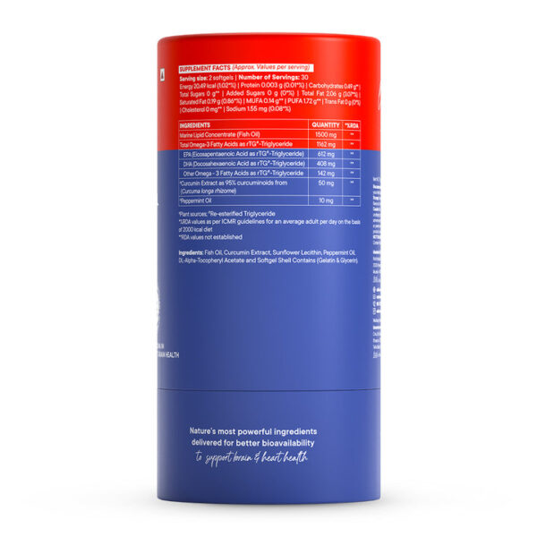 Introducing our 3x strength Omega 3 Fish Oil with highly concentrated 1500 mg Fish Oil with 612mg EPA & 408mg DHA in triglyceride form that helps promote heart, bone, joint, brain & skin health. Sustainably sourced from wild-caught deep sea fish, it’s infused with curcumin & peppermint oil. Our ultra-purified, molecularly distilled, mercury free odorless fish oil is 1.7x more bioavailable vs ethyl ester form. Essenced with lemon & mint, it gives no fishy burp or