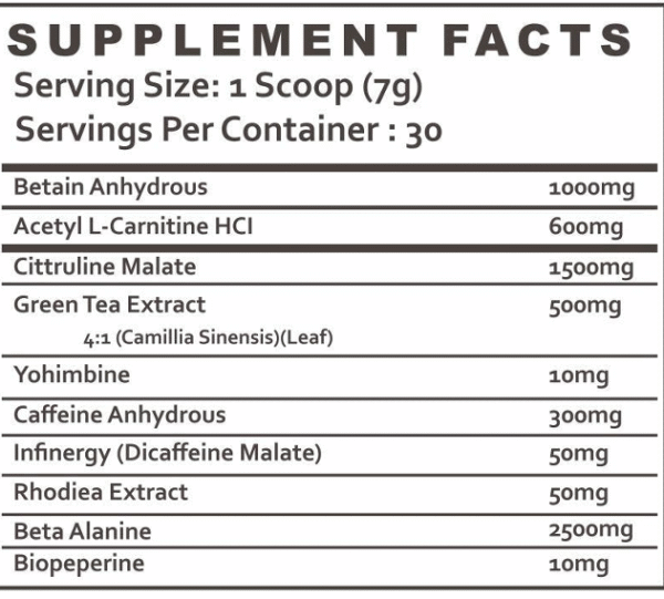• Ingredients such as Beta-Alanine and Citrulline Malate help enhance muscular endurance, improve blood flow, and support better pumps and performance.