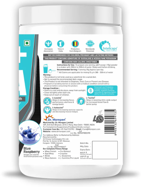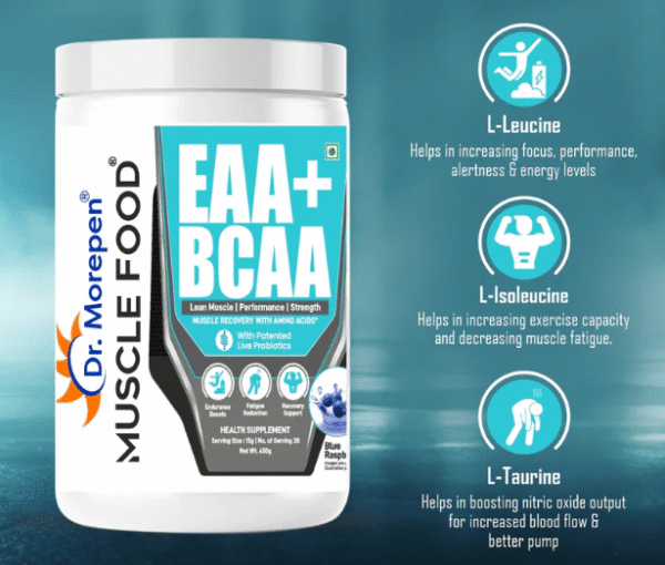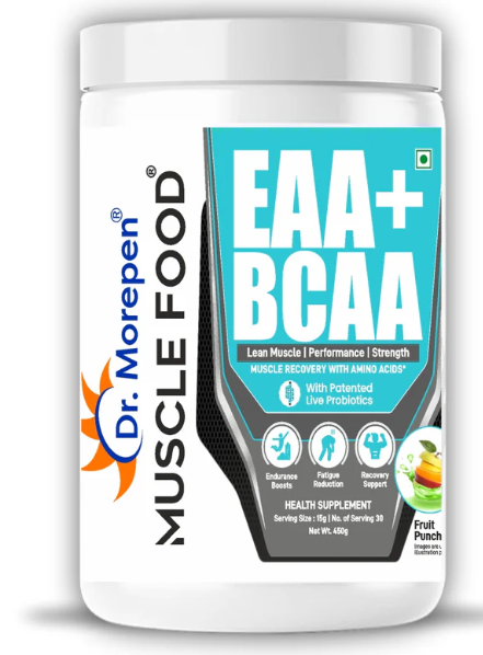 Dr. Morepen Muscle Food EAA + BCAA is a powerful blend of Essential Amino Acids (EAAs) and Branched-Chain Amino Acids (BCAAs) designed to support muscle growth, enhance recovery, improve endurance, and boost overall performance during workouts.