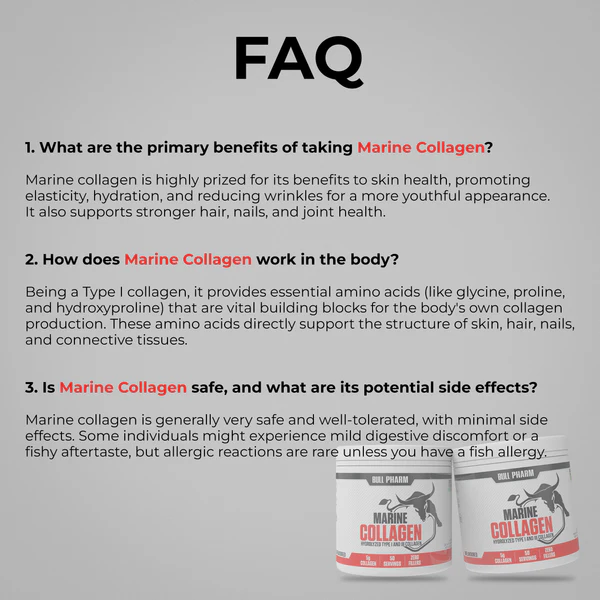 BULL PHARM – MARINE COLLAGEN delivers pure hydrolyzed Type I & III Marine Collagen, enhanced with Hyaluronic Acid, Biotin, Vitamin C, and Glutathione for complete skin and joint nourishment.