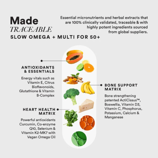 A consciously formulated daily multivitamin + omega supplement targeted for adults aged 50+. This formula combines 39 clinically validated nutrients in pure vegan omega oil to support bone, joint & cardiovascular health while filling nutrient gaps for healthy aging.