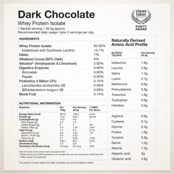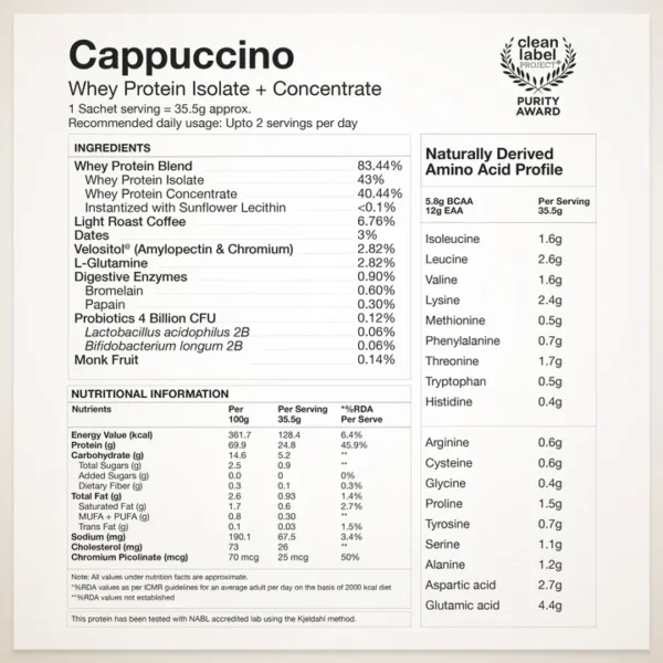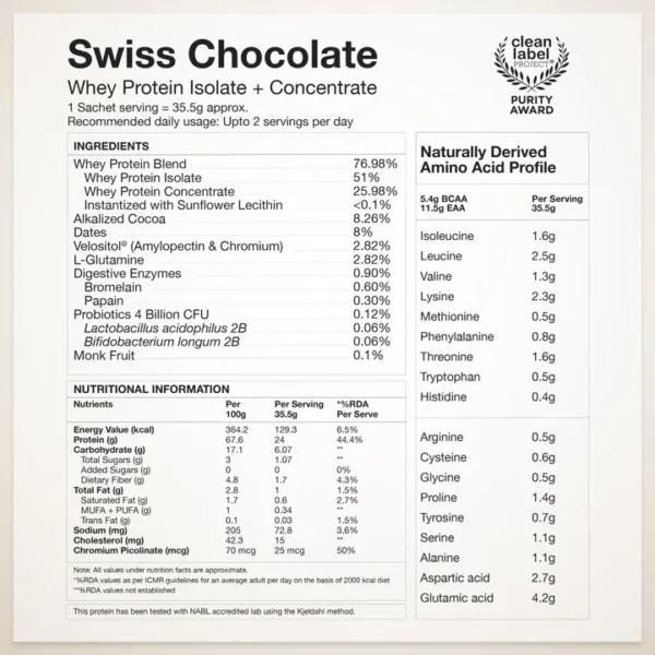 Introducing India’s first Whey protein with Velositol® clinically proven to improve muscle strength & endurance in 8 weeks. Our ultra-pure, fast-absorbing Whey protein delivers pure microfiltered protein, amino acids, with 4 Billion CFU of probiotics & natural digestive enzymes for a gut-friendly dose of goodness without any bloating. Sweetened with zero-calorie monk fruit, our whey protein is instantized for a smooth, light texture, and enriched with delicious flavours, perfect for fueling